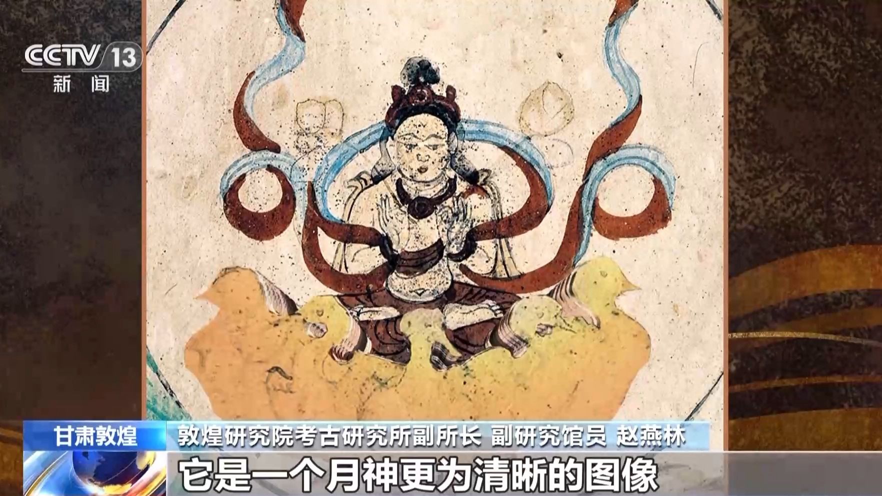 敦煌研究院考古研究所副所长、副研究馆员 赵燕林:它就是一幅典型的中西文化交流的图像,这幅图像当中有月神和月神所驾的鹅车。这幅月天图很明显它是来自古希腊古罗马时期的一种艺术形象,因为在古希腊古罗马的考古资料当中,有大量类似于骑着鹅车的月神图。