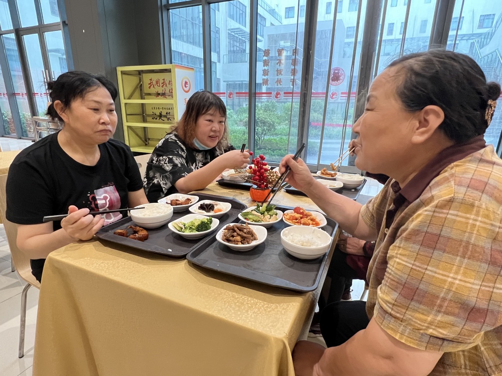 16日中午,在中国福利会国际和平妇幼保健院奉贤院区的职工食堂,几位陪诊家属和医院职工坐在一起,共同享用午餐。几位家属不时看向窗外的狂风暴雨,神情中露出一丝欣慰的笑容。