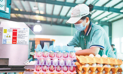 在海南省澄迈县的海南农垦海津益佳牧业有限公司里,工作人员在打包鸡蛋。