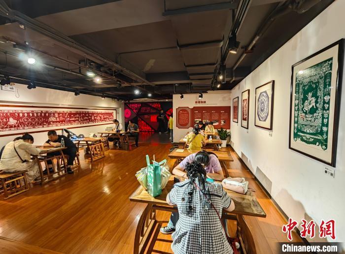 纸花阵展馆内,不少游客体验刻纸互动。孙权 摄