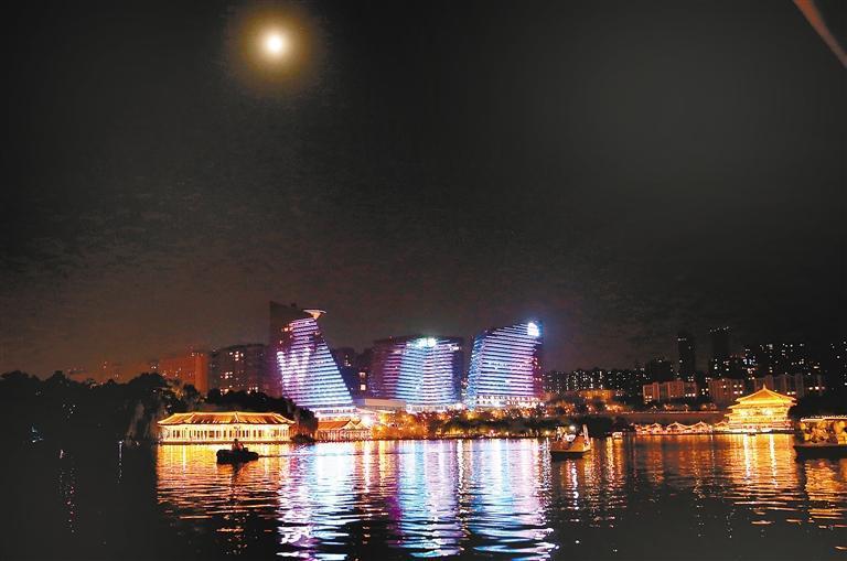 九月十七日,市民游客荡舟曲江池,欣赏中秋明月。 (记者 尚洪涛 摄)