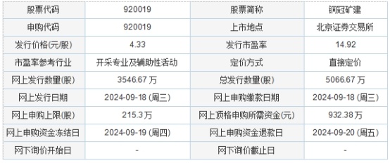 铜冠矿建同日披露的向不特定合格投资者公开发行股票并在北京证券交易所上市发行公告显示,若本次发行成功,超额配售选择权行使前,预计公司募集资金总额21,938.68万元,扣除预计发行费用2,051.08万元(不含增值税)后,预计募集资金净额为19,887.60万元;若超额配售选择权全额行使,预计公司募集资金总额为25,229.48万元,扣除预计发行费用2,252.94万元(不含增值税),预计募集资金净额为22,976.54万元。