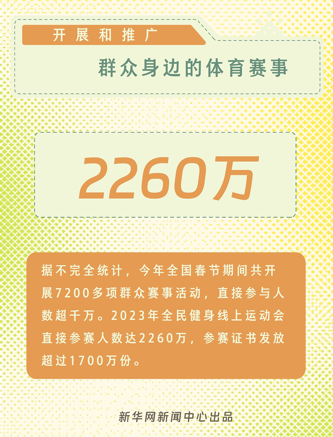 三是以更加丰富的全民健身赛事活动供给确保群众“健好身”。目前,全运会群众赛事活动、全国全民健身大赛、社区运动会已成为品牌,每年开展的新年登高、全民健身日等8个全国性全民健身主题示范活动序时开展,“三大球”、群众冰雪、各类体育社会组织开展的群众赛事活动重点推动,群众展示健身成果的平台更加广阔。