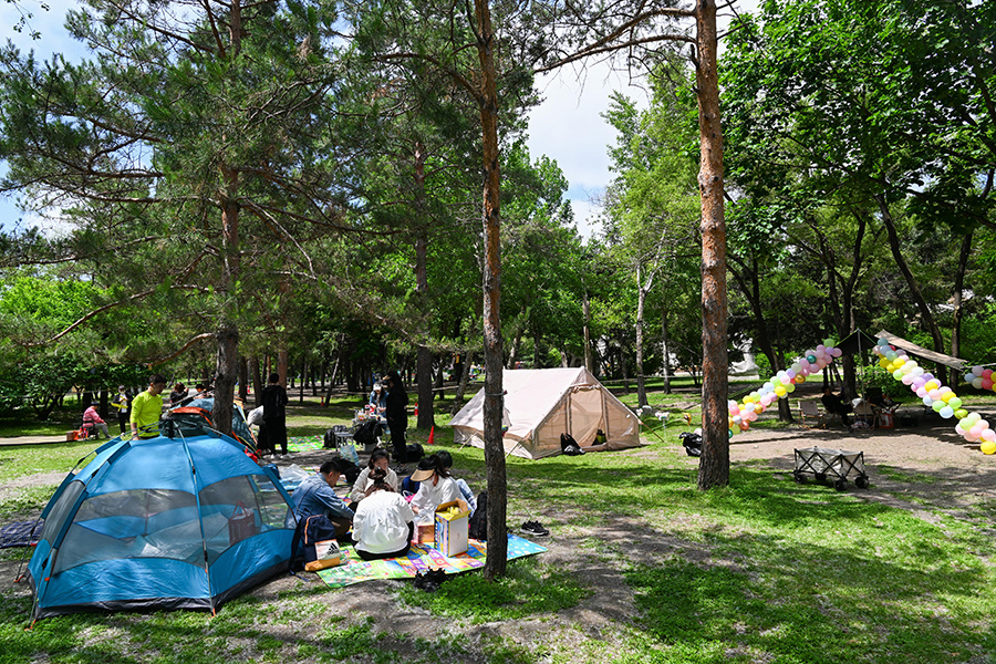 图为6月4日拍摄的游人在太阳岛风景区的露营区体验游玩。新华社发