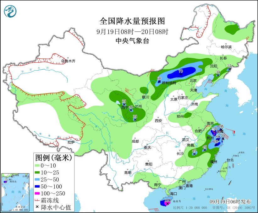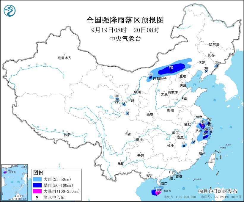 9月19日08时至20日08时,内蒙古中部、河北北部、安徽东南部、江苏南部、上海、浙江大部、海南岛以及青海东北部、甘肃西南部、辽宁中部、福建西北部、江西中部等地部分地区有大到暴雨,其中,江苏南部、浙江北部、海南岛东南部等地部分地区有大暴雨(100~150毫米)。甘肃河西、内蒙古西部和东南部、上海大部、浙江、海南岛等地有5~6级,阵风7~8级的大风。渤海将有7~8级、阵风9~10级东北风,杭州湾、东海北部海域将有7~9级、阵风10~11级的大风,南海南部、北部湾将有7~8级、阵风9级的大风。