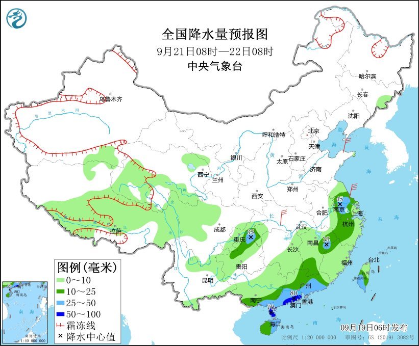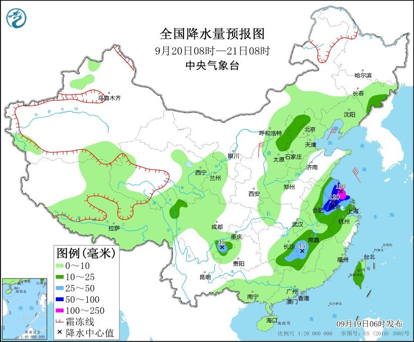 全国降水量预报图(9月19日08时-20日08时)图片来源:中央气象台网站