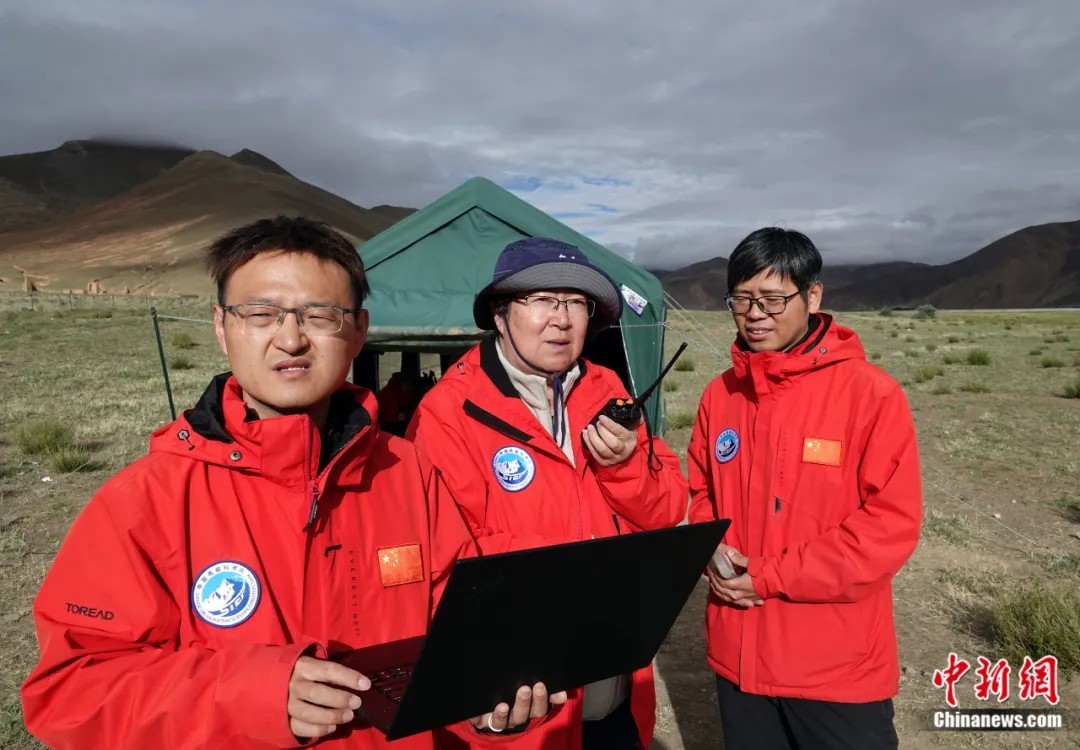 珠峰地区首次水—热—碳通量航空观测试验科研团队负责人贾立研究员(中)和队员在试验场讨论,与无人机起降点工作人员联系。中新社记者 孙自法 摄