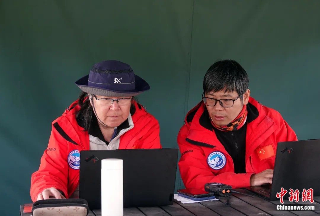珠峰地区首次水—热—碳通量航空观测试验科研团队负责人贾立研究员(左),在试验场指帐篷内与科考队员讨论观测方案。中新社记者 孙自法 摄