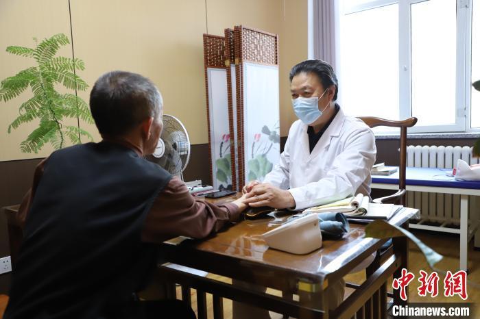 图为集宁区桥西街道综合养老服务中心的医生为居民把脉。 中新网记者张林虎摄