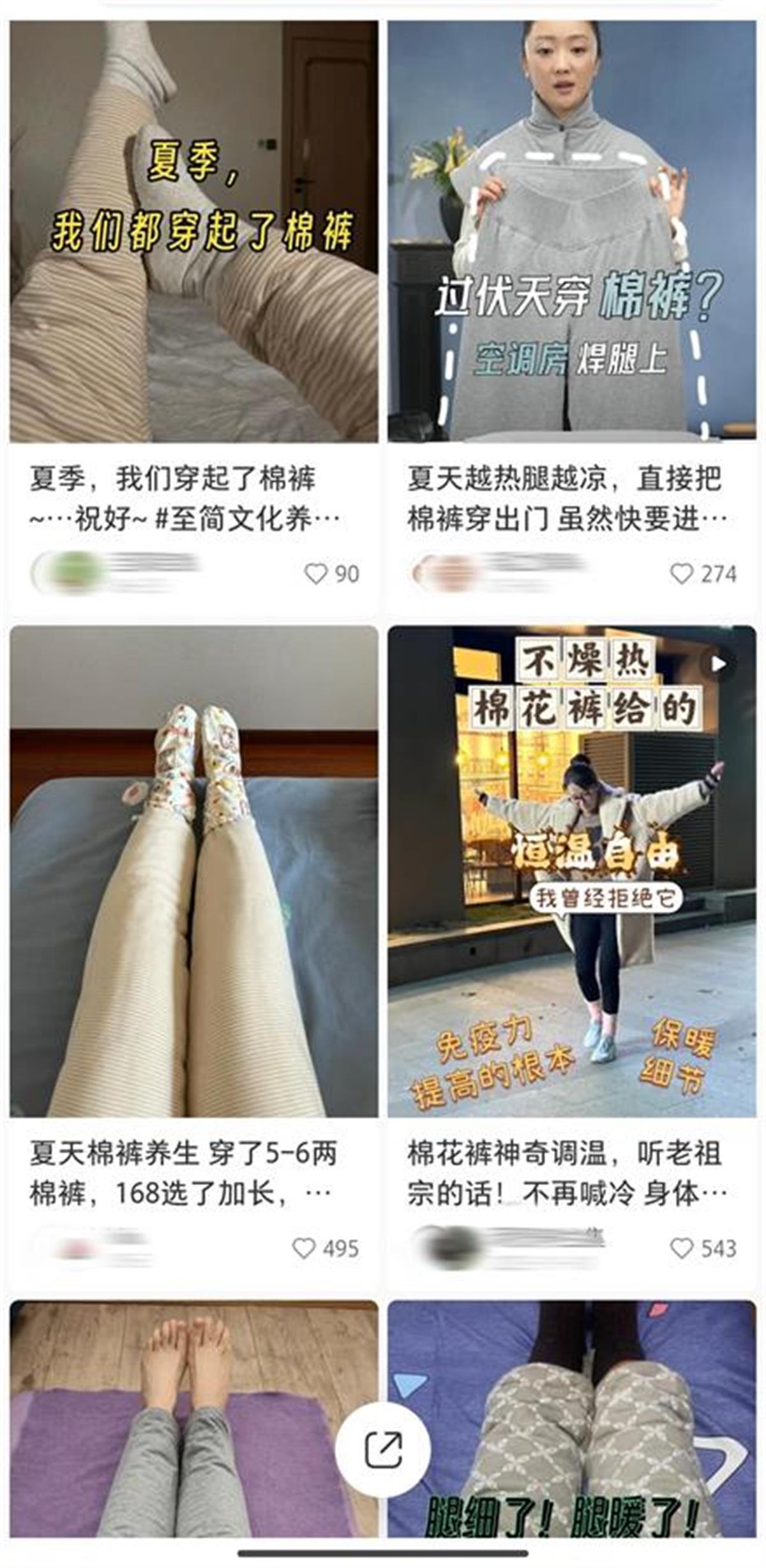虽然二十四节气中的白露已过,但白天气温仍较高,不少人直呼好热。但在多个社交平台,有不少网友分享“夏季养生棉裤”“穿棉裤养生”等帖子。粗略估计,相关内容已超3万篇,在网上引来不少关注和讨论。