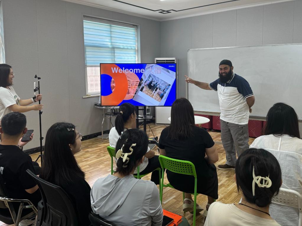 9月6日,巴基斯坦商人哈菲兹·阿布巴卡尔受邀来到保定白沟天尚行箱包皮具有限公司,同外贸人员分享营商之道。新华社记者 王美祺 摄