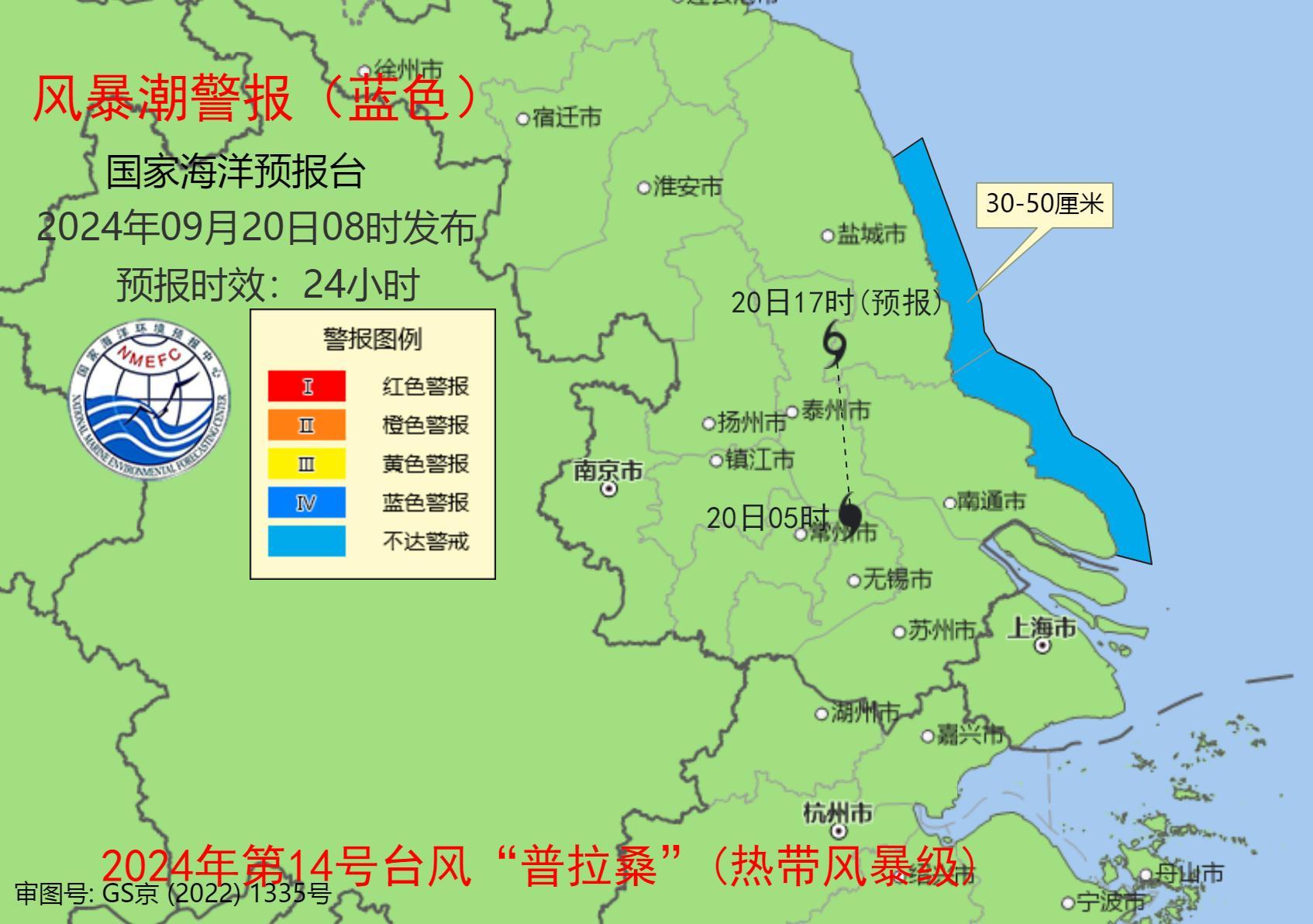 中新网9月20日电 据中国海洋预报网消息,国家海洋预报台根据《海洋灾害应急预案》,发布风暴潮蓝色警报。受今年第14号台风“普拉桑”(热带风暴级)的影响,预计:20日早晨至下午,江苏中南部沿海将出现30到50厘米的风暴增水。风暴潮预警级别为蓝色。预计20日下午解除风暴潮警报。请沿海政府及相关部门按照职责做好防御风暴潮的应急准备工作;各涉海相关生产单位采取积极有效的措施,组织渔船、养殖渔排、养殖场等做好防御工作;加固沿海渔业养殖水产设施和渔港设施,做好防潮准备。