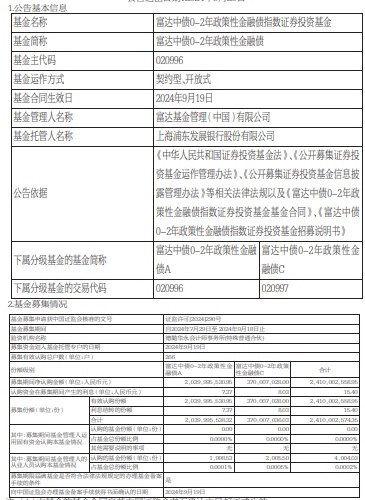募集期间净认购金额2,410,002,558.95元,认购资金在募集期间产生的利息15.40元,募集份额合计2,410,002,574.35份。