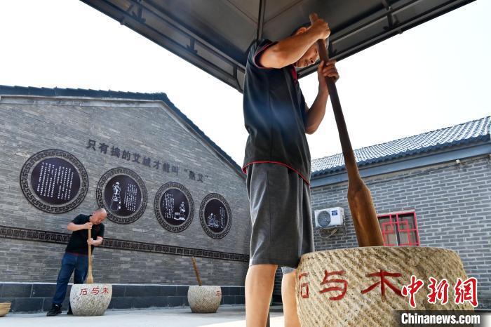 8月30日,在河北省衡水市冀州区石与木艾草文化园,工人利用石臼和木杵捣艾绒。 中新网记者 翟羽佳 摄