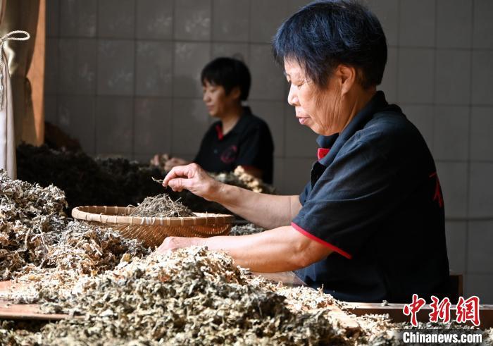 8月30日,在河北省衡水市冀州区石与木艾草文化园,工人挑拣艾叶。 中新网记者 翟羽佳 摄