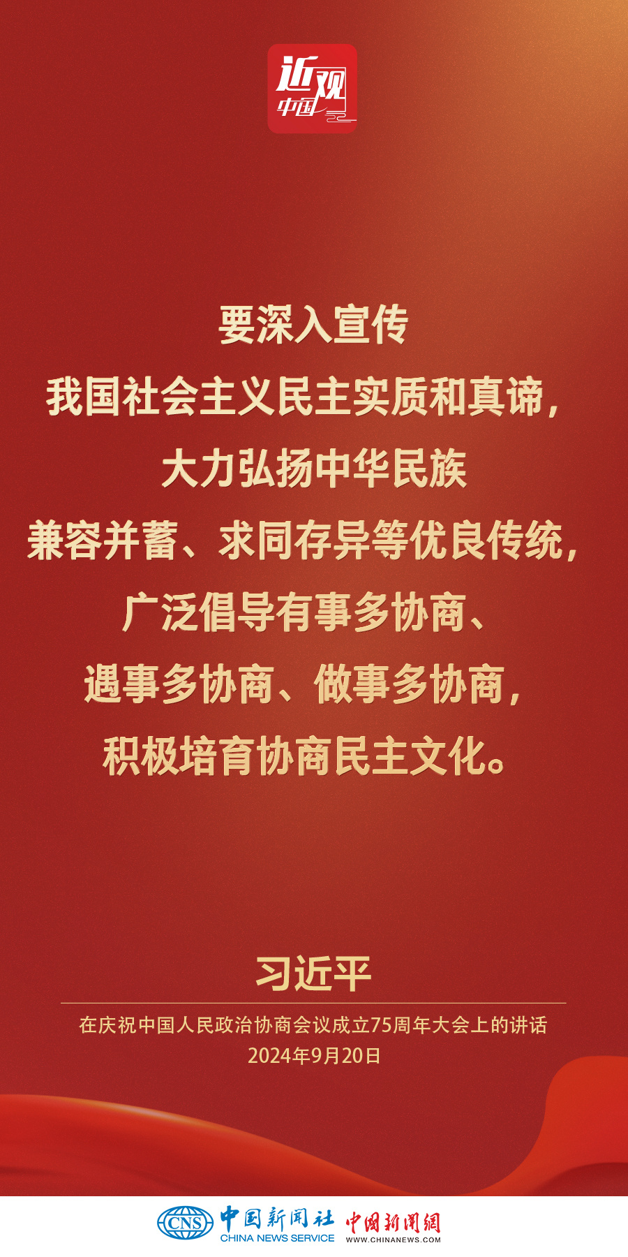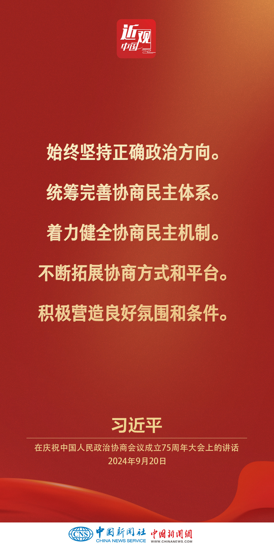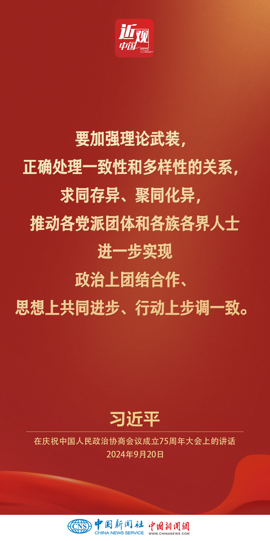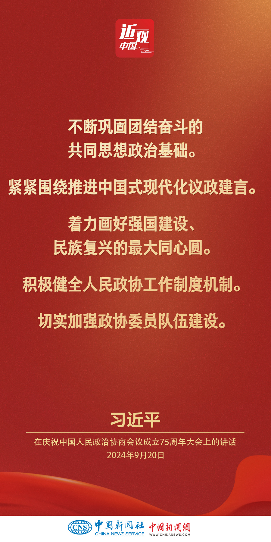 中共中央、全国政协20日上午在全国政协礼堂隆重举行庆祝中国人民政治协商会议成立75周年大会。中共中央总书记、国家主席、中央军委主席习近平出席大会并发表重要讲话。他强调——