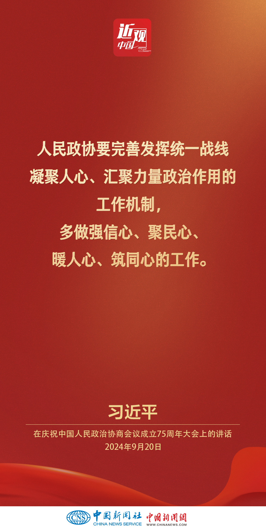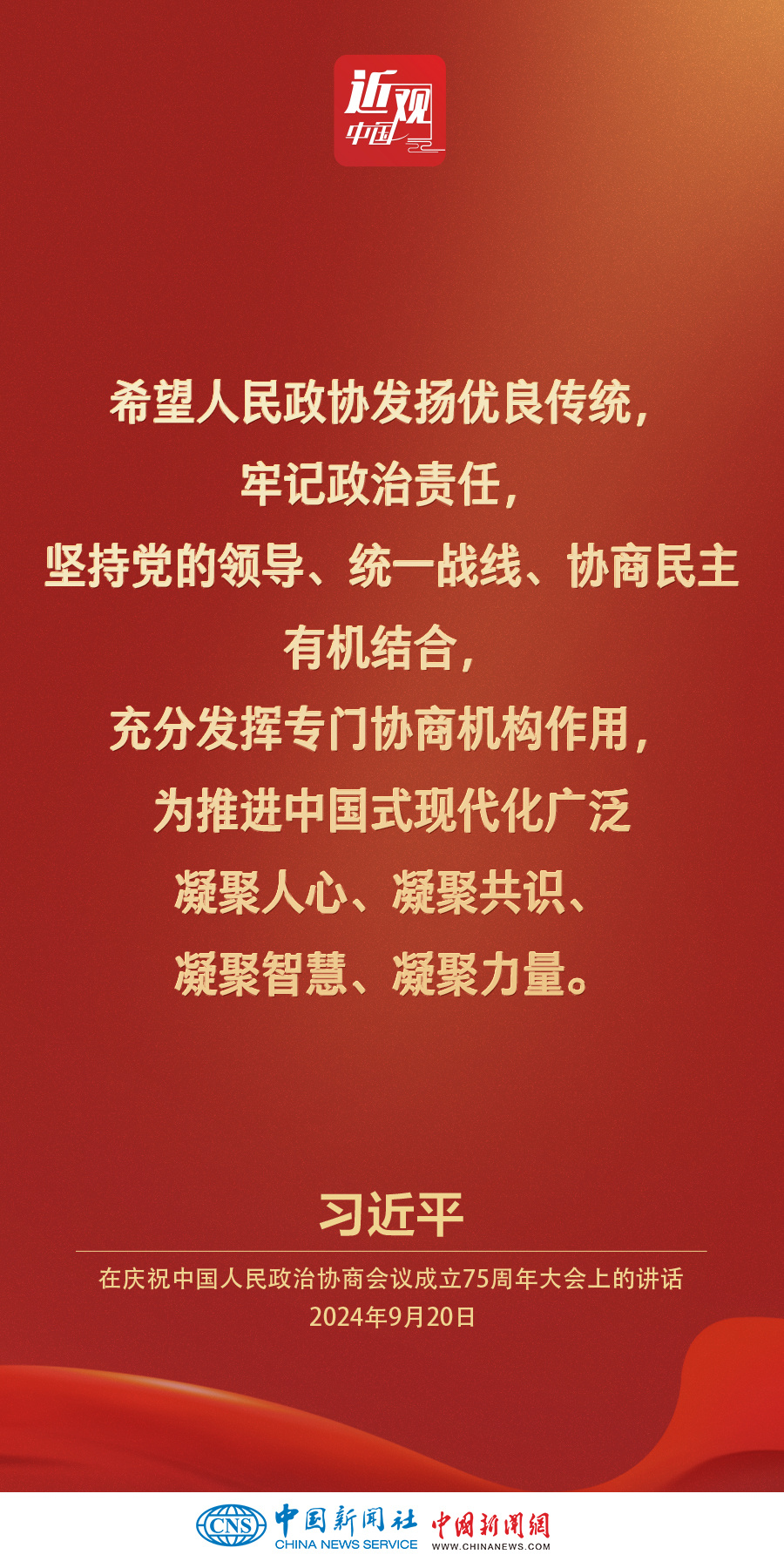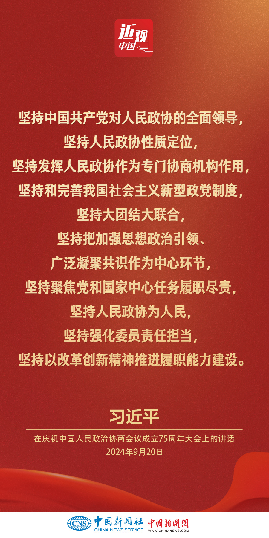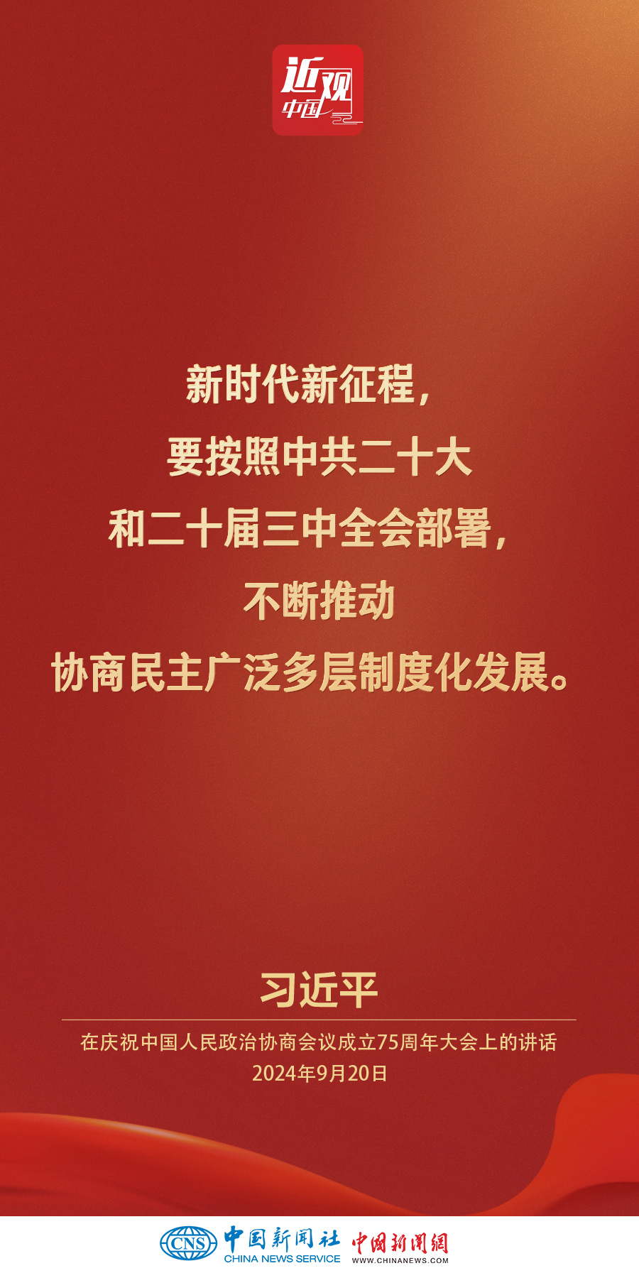 中共中央、全国政协20日上午在全国政协礼堂隆重举行庆祝中国人民政治协商会议成立75周年大会。中共中央总书记、国家主席、中央军委主席习近平出席大会并发表重要讲话。他强调——