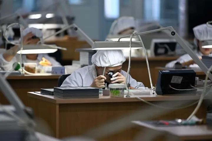 在天津海鸥表业集团生产车间内,员工在操作台前组装手表。新华社记者 李然 摄