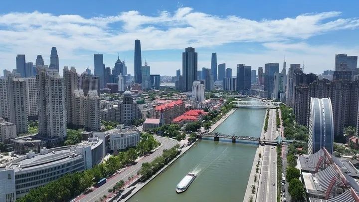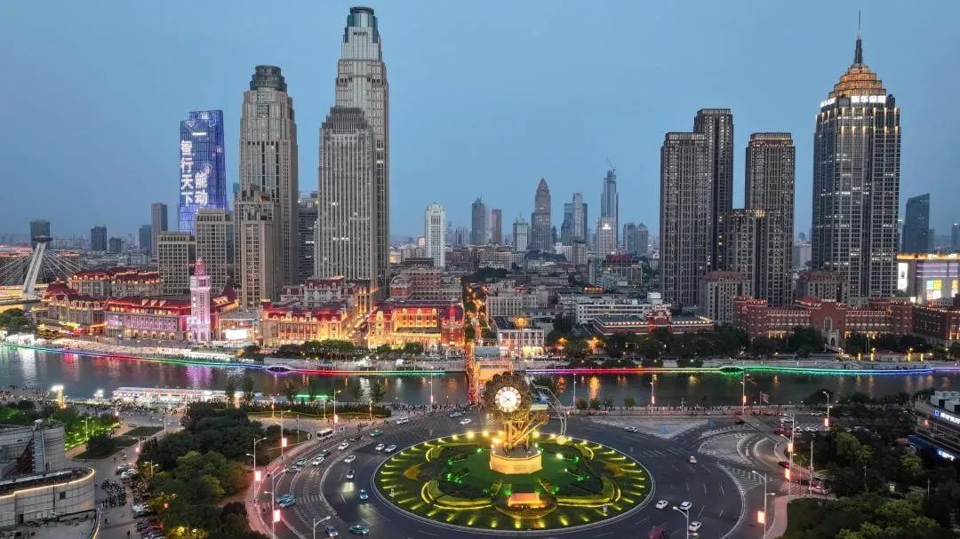 这是天津地标建筑“世纪钟”及海河沿岸建筑群。新华社记者 孙凡越 摄