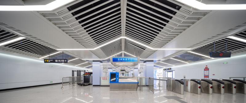 除了科技感十足的展陈,该车站的设计也别具巧思。挑高的屋脊蓝白相间,贯穿式LED灯带点缀其中,为车站中部营造了明亮开阔的空间感。站厅层的文化墙具有强烈的视觉冲击力,将城市建筑群以艺术化的眼球图形设置为中心,向四周发散,运用大数据和信息化的相关视觉元素,传递用科技放眼未来的内涵。试乘现场,高校师生们一起拿着标语牌组团留影。“因为学校离城区远,出行一直是个难题。今日试乘只用了2分钟车程,我们就从西安国际医学中心抵达了学校南校区。以后不用换乘其他交通工具,出了校门就能坐上地铁,想去哪儿都方便。”西安电子科技大学学生井杰凯激动地说。