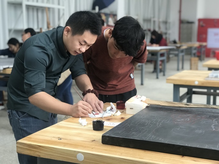 2018年,仁青郎加(右)跟老师学习漆画技法。(受访者供图)
