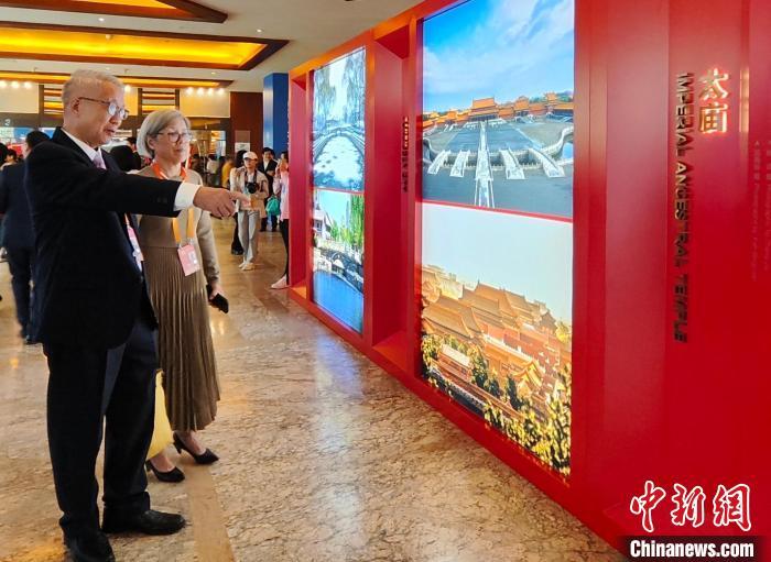 中新社北京9月21日电 (记者 杜燕 徐婧)蓝天白云下的鼓楼、安静横跨在河面上的万宁桥、恢弘壮丽的故宫、古朴典雅的永定门……“人类的记忆——中国世界遗产”摄影展,在2024北京文化论坛会议厅外吸引中外嘉宾驻足。来自马来西亚的建筑师张建文等嘉宾边走边聊:“北京中轴线是中华文明连续发展的产物,是人类文化遗产不可或缺的一部分。”