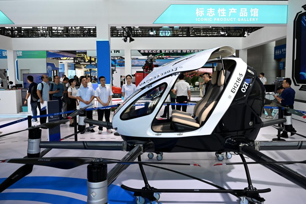 9月20日,在2024世界制造业大会上,人们了解一款载人级无人驾驶电动垂直起降航空器。新华社记者 黄博涵 摄