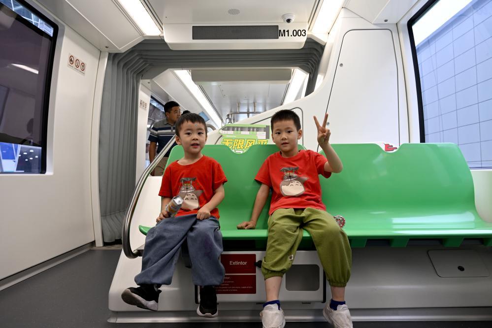 9月21日,在2024世界制造业大会上,小朋友体验一款跨座式单轨列车。新华社记者 黄博涵 摄