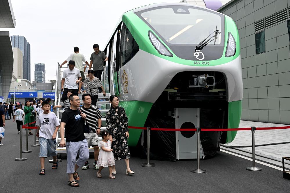 9月21日,在2024世界制造业大会上,人们参观体验一款跨座式单轨列车。新华社记者 黄博涵 摄