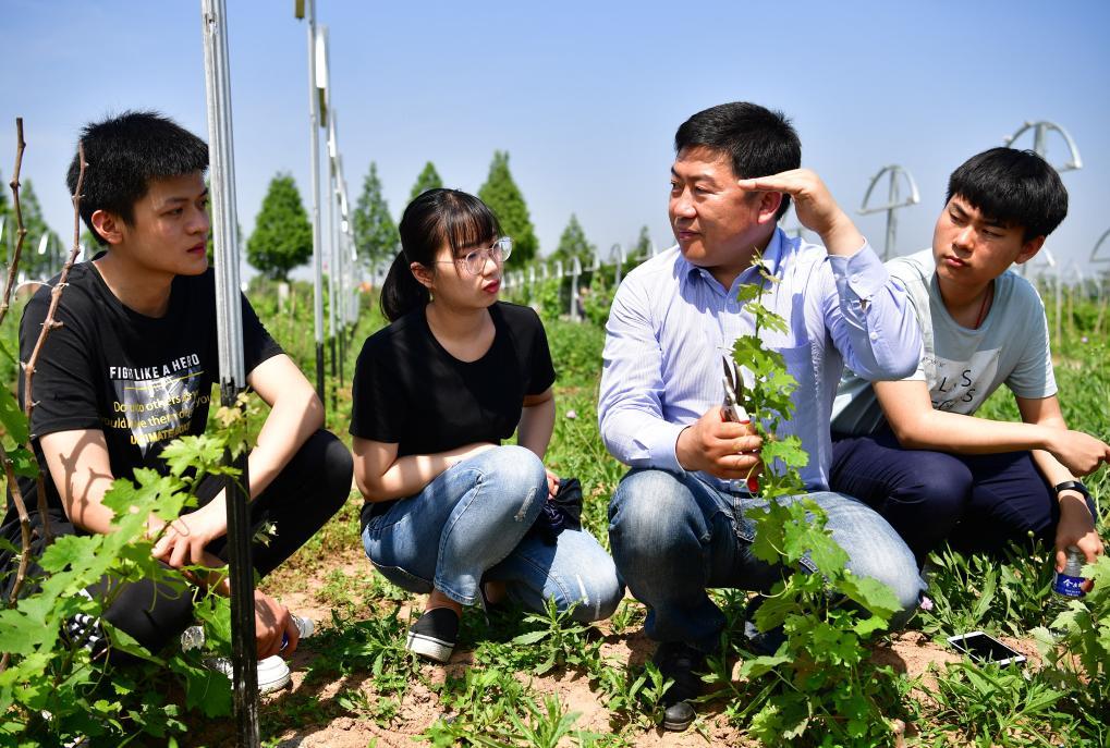 时任葡萄酒学院院长的房玉林(右二)在为学生讲解葡萄管理技术。新华社记者 邵瑞 摄