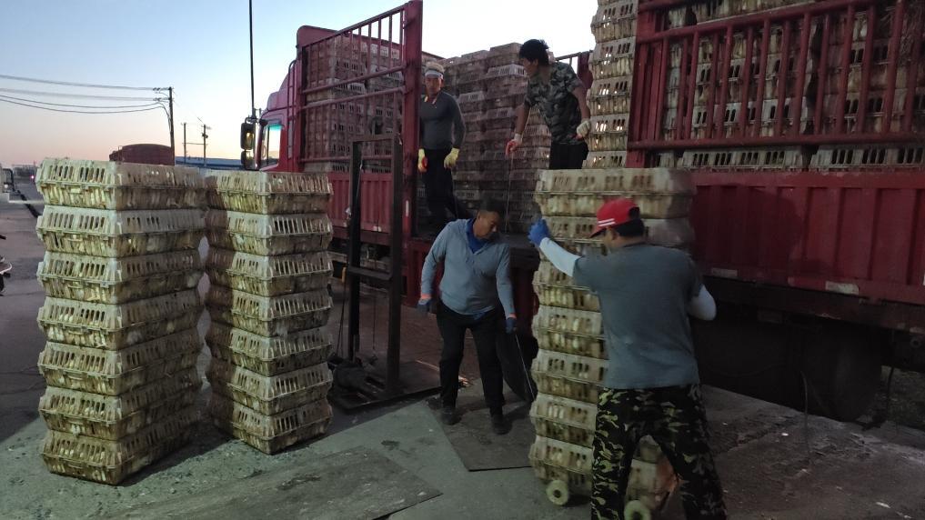 9月22日清晨,立业养殖农场工人正在将肉鸡装车。(受访者供图)