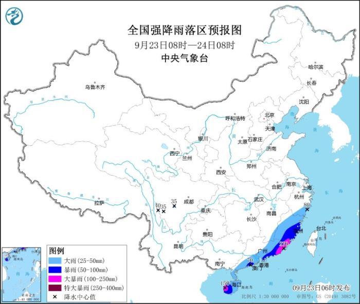 预计,9月23日08时至24日08时,浙江东南部、福建大部、广东东部和南部、海南岛等地部分地区有大到暴雨,其中,福建东南部、广东东南部、海南岛西部等地部分地区有大暴雨,广东东南部沿海局地特大暴雨(250~270毫米)。上述部分地区伴有短时强降水(最大小时降雨量20~50毫米,局地可超过60毫米),局地有雷暴大风等强对流天气。中央气象台9月23日06时继续发布暴雨黄色预警。