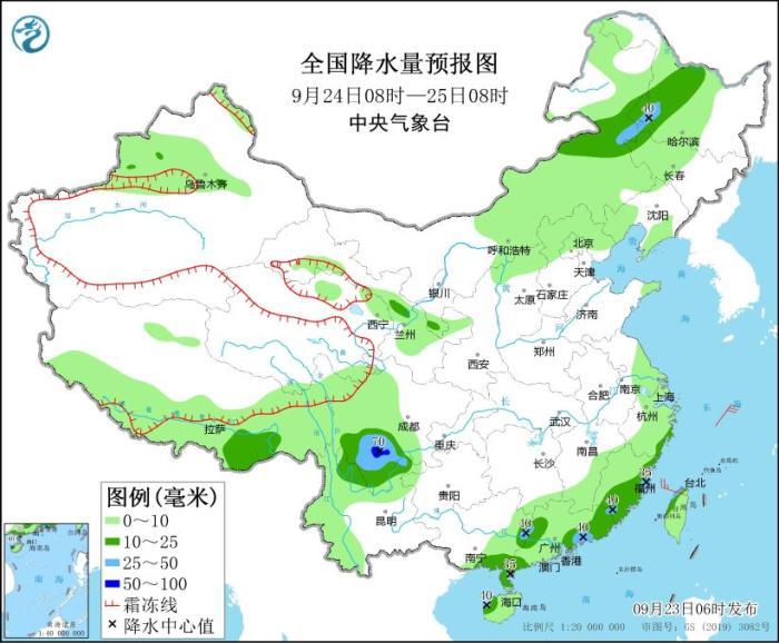 9月24日08时至25日08时,浙江东南部、福建东部和南部、广东东南部和西部、广西东南沿海、海南岛西部、四川南部、内蒙古东部、黑龙江中西部、吉林西部、甘肃中部、西藏南部等地部分地区有中到大雨,其中,福建南部、四川南部等地部分地区有暴雨(50~70毫米)。