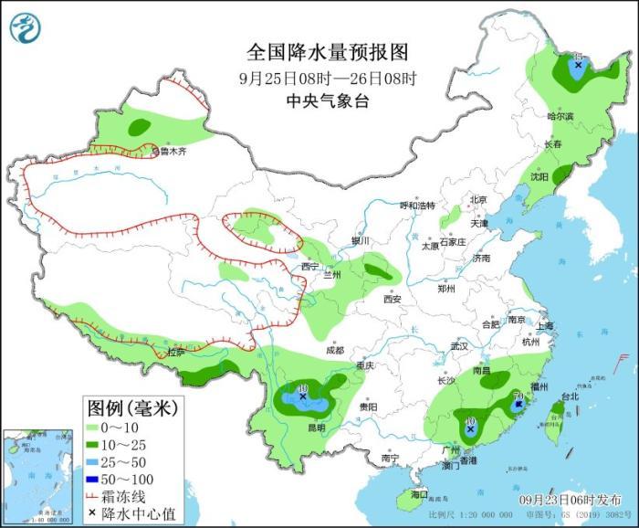 9月25日08时至26日08时,黑龙江中北部、新疆沿天山地区、西藏南部、云南北部、四川南部、江西东部和南部、福建东南部、广东北部、台湾岛北部等地部分地区有中到大雨,其中,福建东南部部分地区有暴雨(50~70毫米)。