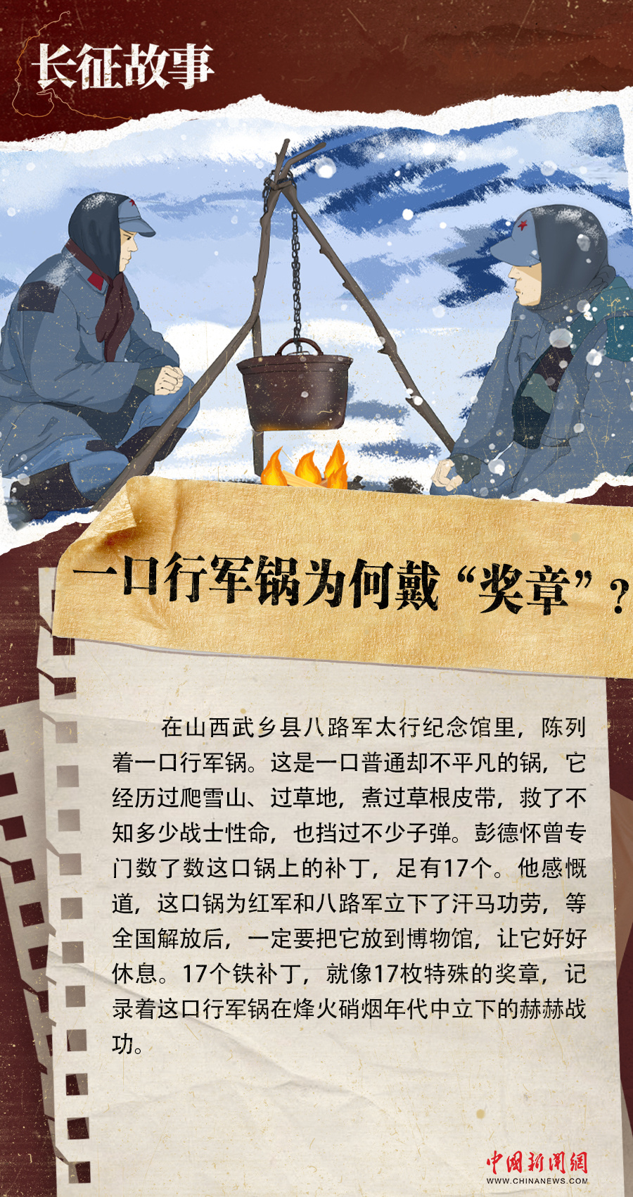 在山西武乡县八路军太行纪念馆里,陈列着一口行军锅。这是一口普通却不平凡的锅,它经历过爬雪山、过草地,煮过草根皮带,救了不知多少战士性命,也挡过不少子弹。彭德怀曾专门数了数这口锅上的补丁,足有17个。他感慨道,这口锅为红军和八路军立下了汗马功劳,等全国解放后,一定要把它放到博物馆,让它好好休息。17个铁补丁,就像17枚特殊的奖章,记录着这口行军锅在烽火硝烟年代中立下的赫赫战功。
