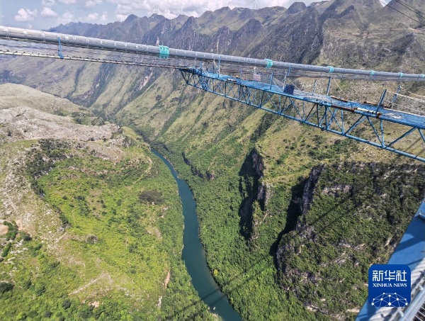 花江峡谷大桥的建设者借助猫道在高空施工。新华社记者向定杰 摄