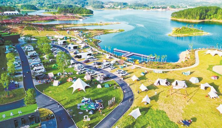 牛车河水库,有“鄂东千岛湖”之称。沿路探访,这条路线上景色宜人,一路山水美景、红色故事。在牛车河月亮湾露营基地,湖面波光粼粼,岛屿星罗棋布。坐在帐篷里,团风县思源小学的周老师一行正欣赏美景。乡村客厅、百丈崖古民居、大崎山……沿线可供游玩的自然景点达30余处。
