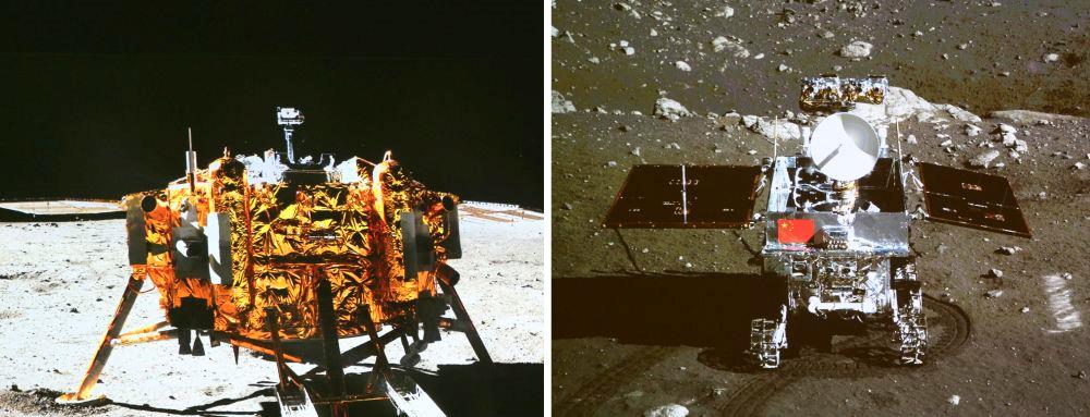 △2013年12月15日晚,正在月球上开展科学探测工作的嫦娥三号着陆器和巡视器进行互成像实验,“两器”顺利互拍,嫦娥三号任务取得圆满成功。