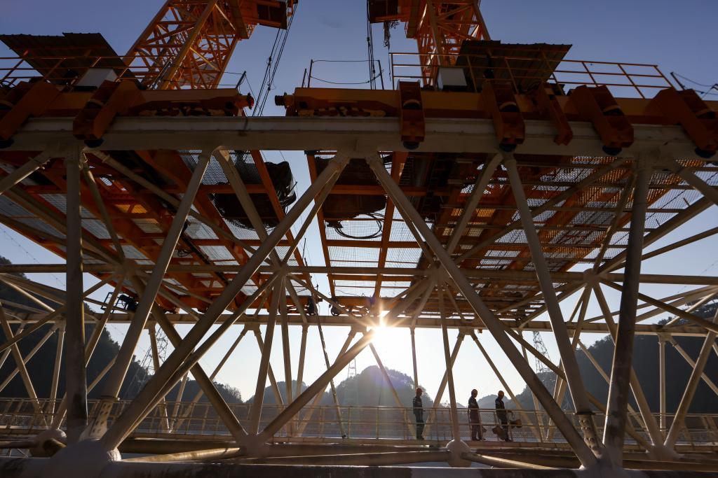 2021年12月19日,工作人员从“中国天眼”圈梁上经过。