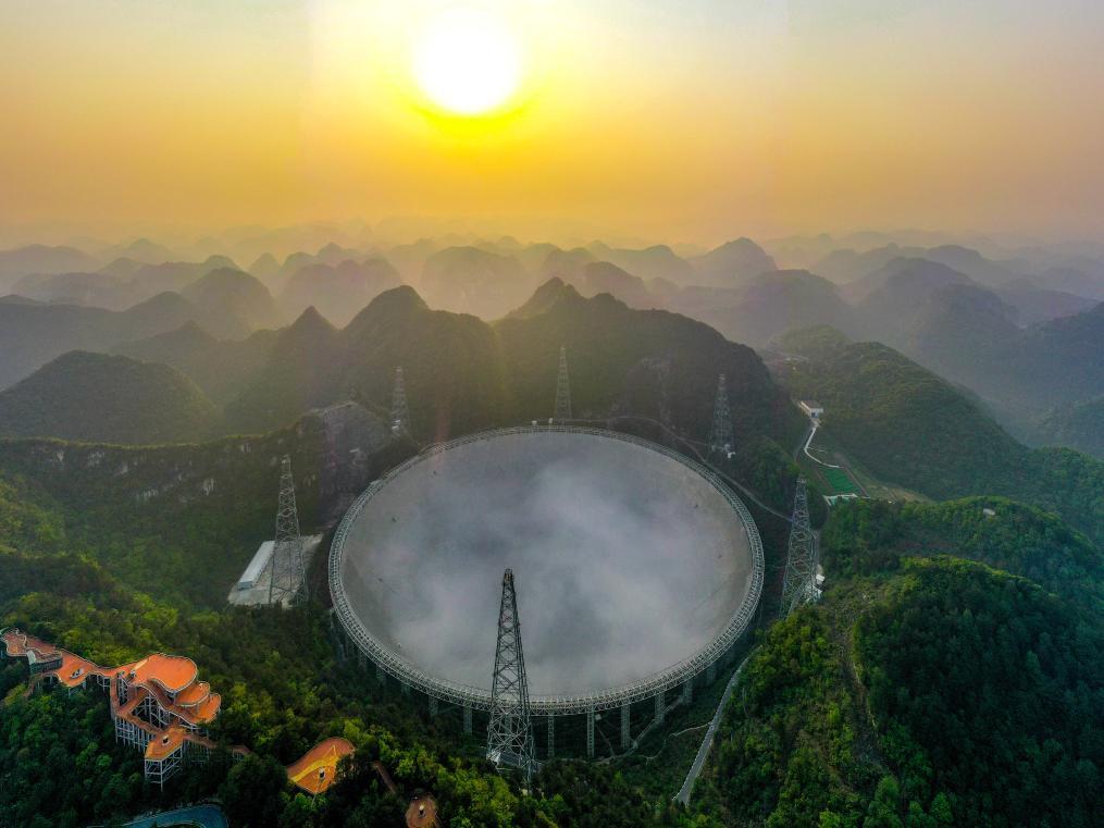 2021年3月31日,晨曦中的“中国天眼”(无人机照片,维护保养期间拍摄)。