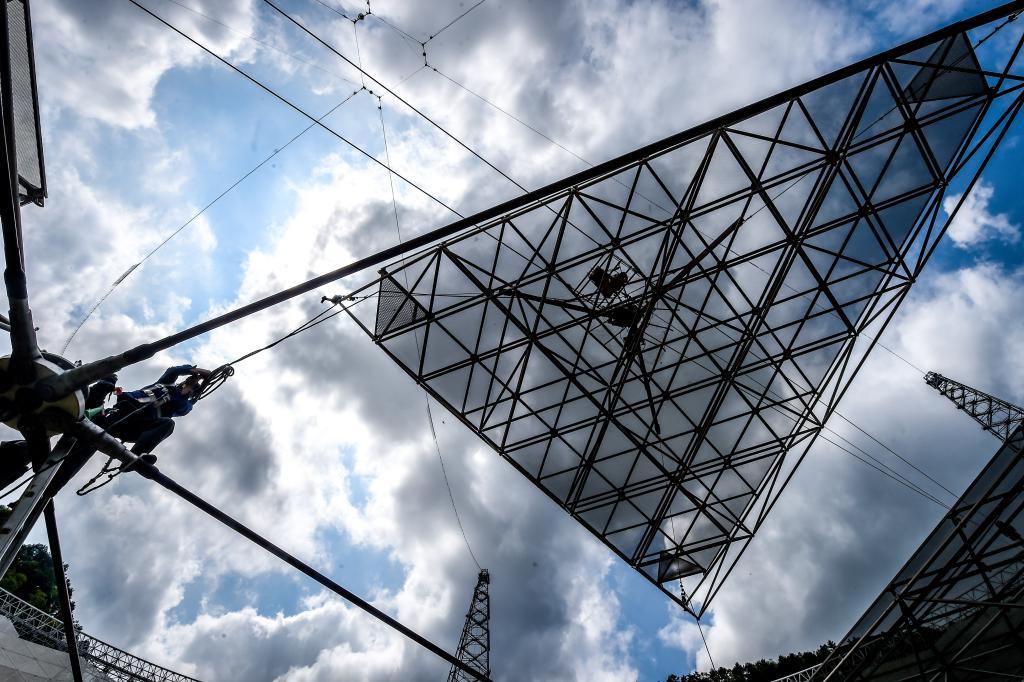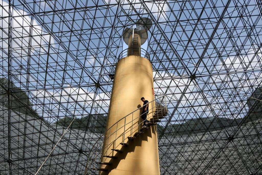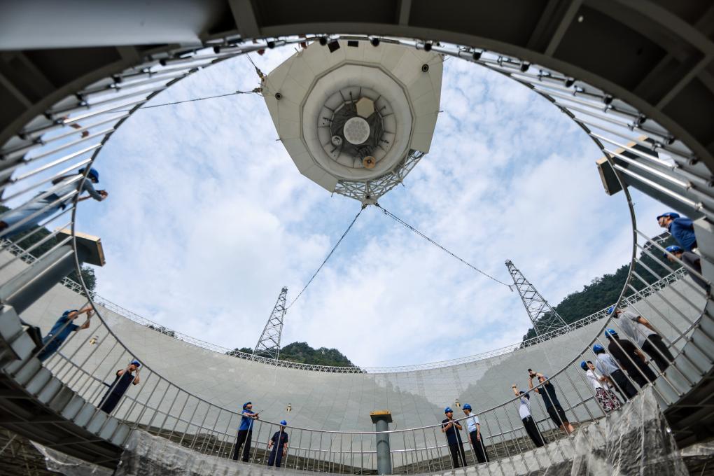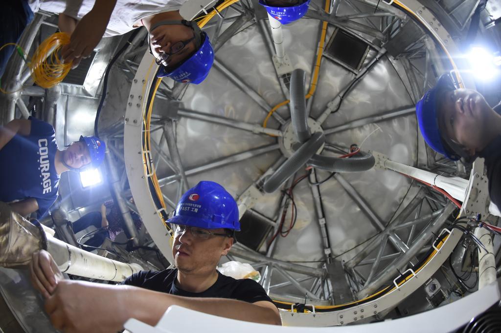 2017年8月10日,工作人员在“中国天眼”馈源舱内工作。