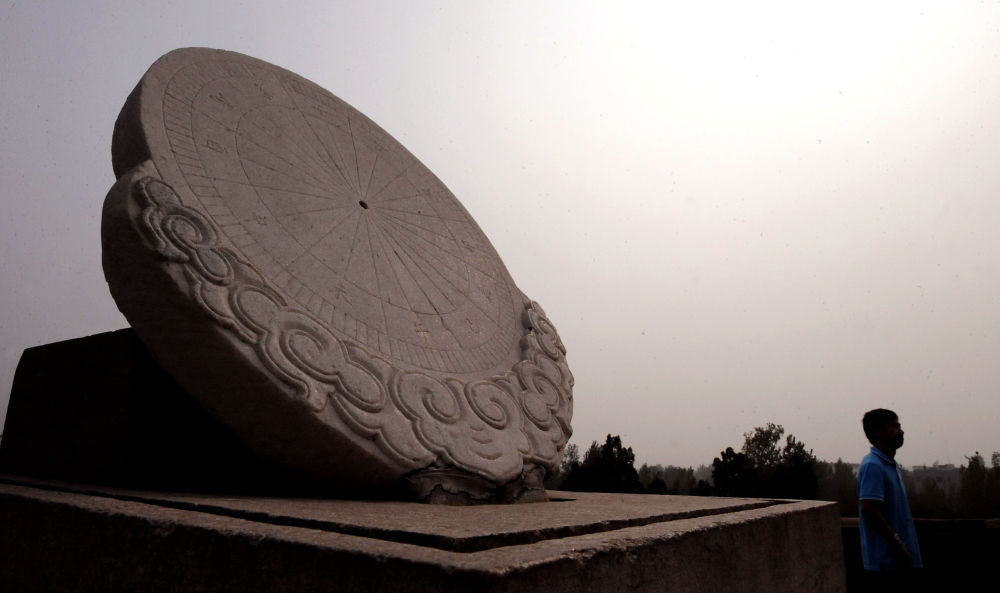 这是安放在观星台顶部的一种古代天文仪器:日晷。新华社记者朱祥摄