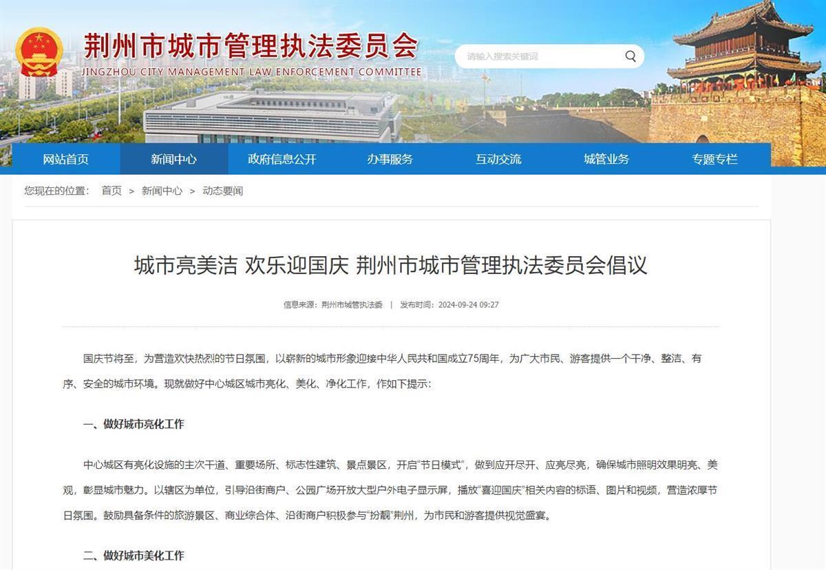 9月24日,荆州市城管执法委发布《城市亮美洁 欢乐迎国庆 荆州市城市管理执法委员会倡议》,重点就做好中心城区城市亮化、美化、净化工作做出具体工作安排。