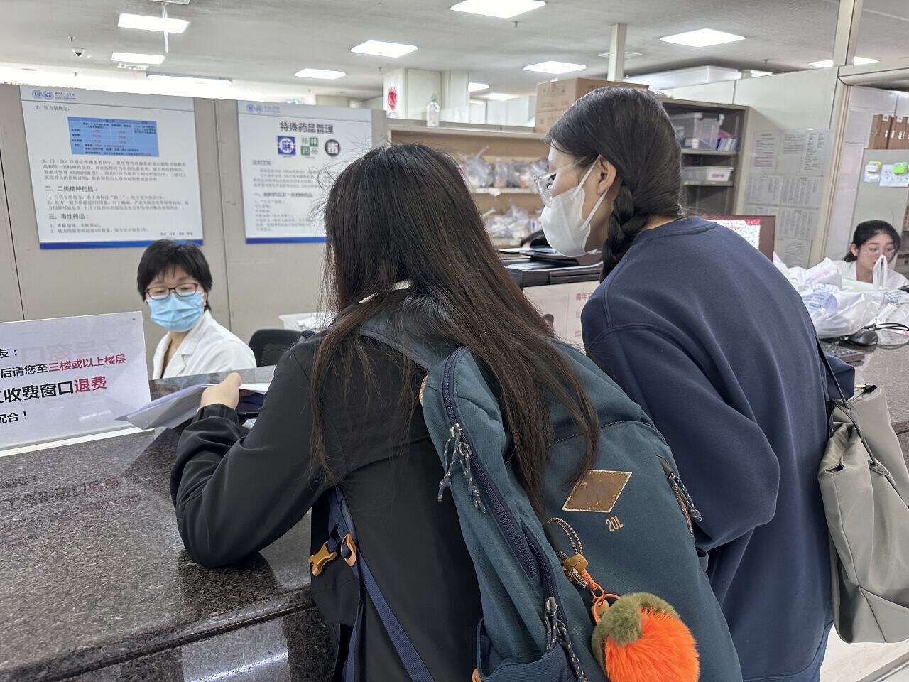 粥粥(左一)在药房窗口询问 记者 汪雨晨 摄