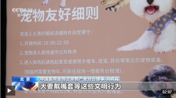 中国畜牧业协会宠物产业分会理事 刘晓霞:很多的公共场合已经开始有宠物友好的咖啡店、宠物友好的餐厅、宠物友好的商场。从养宠的意识上和接受养宠这件事情的意识上也会不断地提升和改变。尤其是年轻养宠人群的增加,对于这个事情的包容性有非常大的促进作用。我们也倡导养宠人群能够为社会做更多自我约束,执行文明养宠物的一些规则,比如说出门牵犬一定要带牵引绳,公众场合的时候,犬要戴嘴套等这些文明行为,它一定是一个相互的行为。
