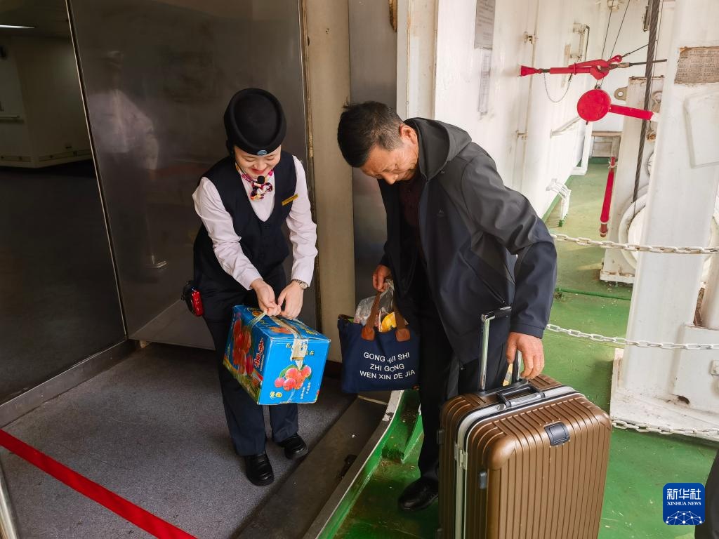 9月26日,客运员在中铁渤海号渡船帮助旅客提行李。