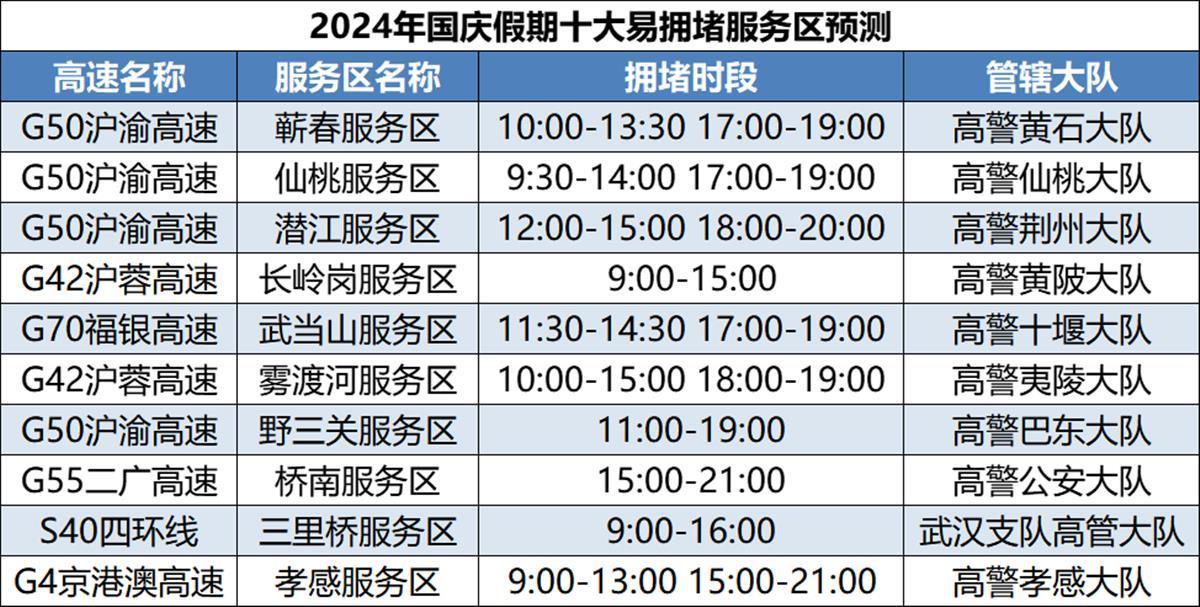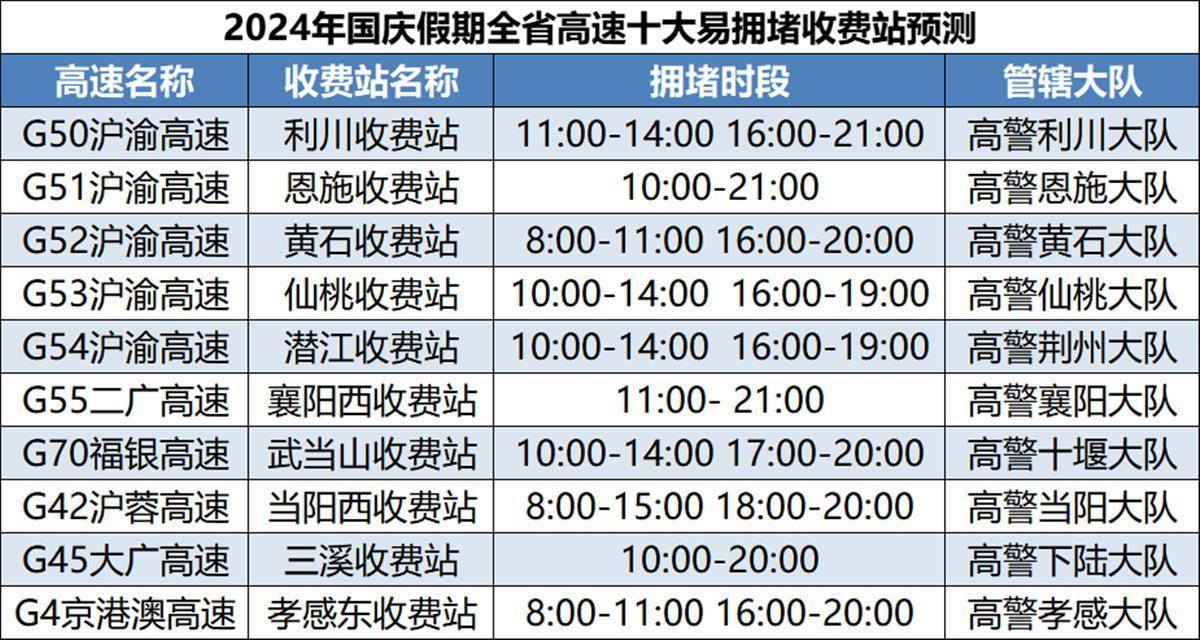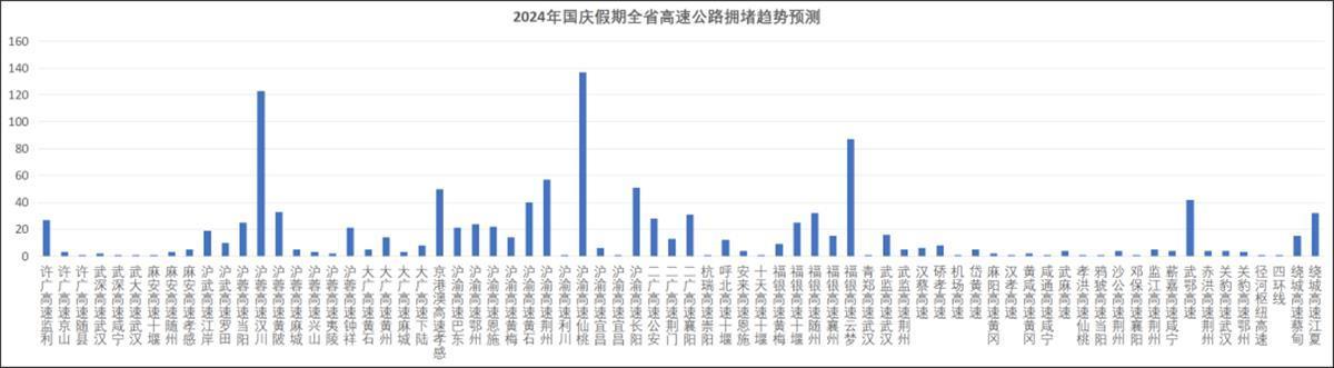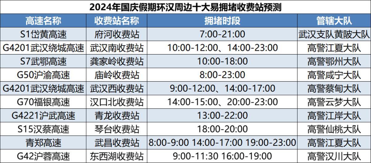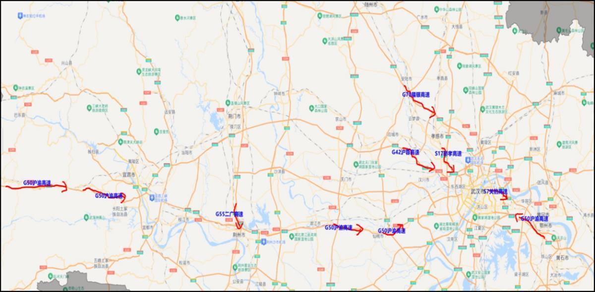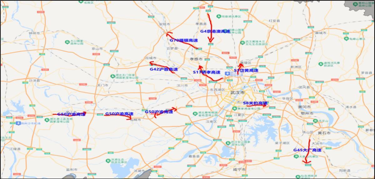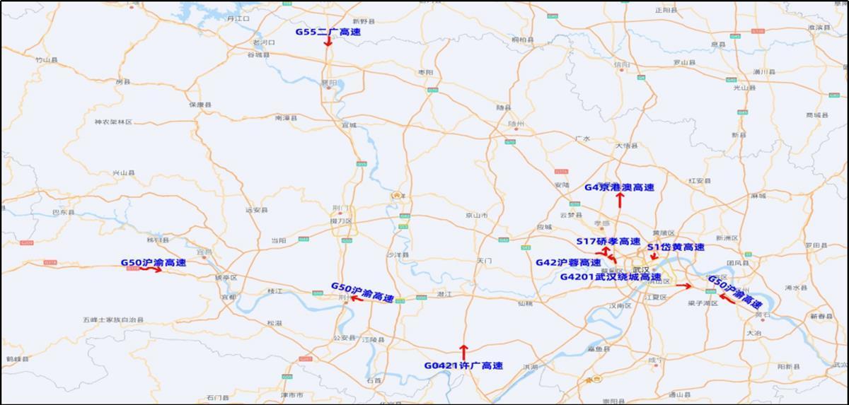 沪渝仙桃、荆州、长阳段,京港澳孝感段,福银云梦、随州段,武鄂、武监高速,武汉绕城江夏段,沪蓉汉川、黄陂段,二广襄阳段等高速拥堵风险高。