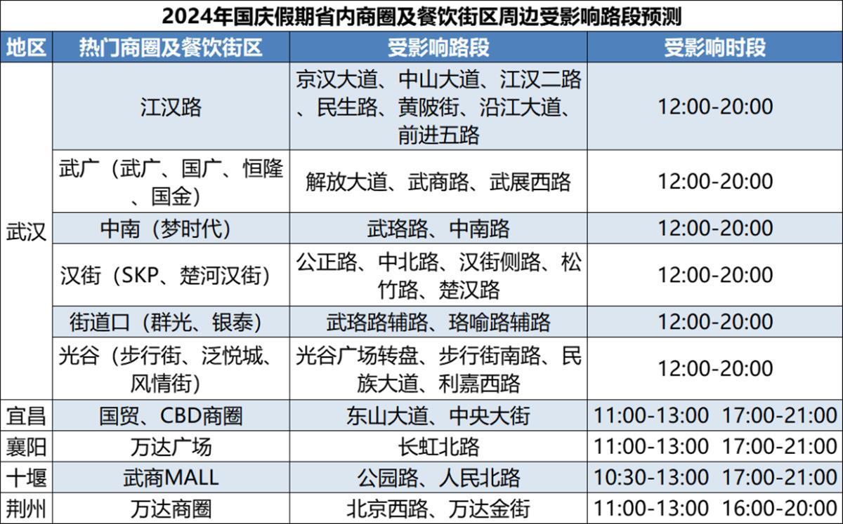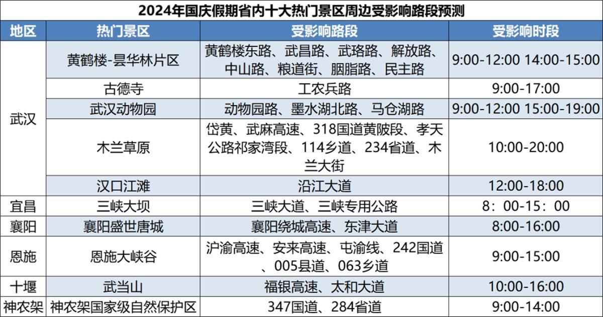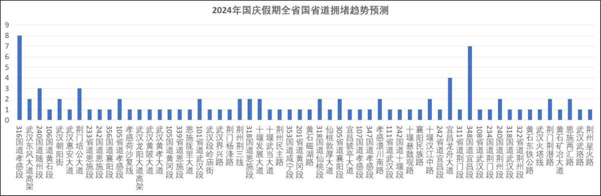G316国道孝感段,G318国道仙桃段,G348国道宜昌、恩施段,G240国道随州段及宜昌龙舟大道、荆门培公大道、十堰汉江中路等路段拥堵风险高。
