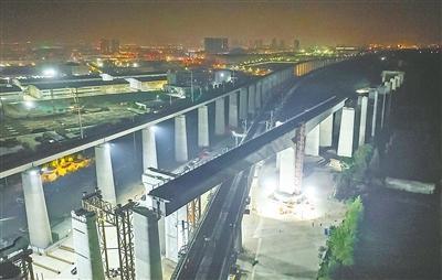 湖北日报讯 (记者戴辉、通讯员李晓晖)9月27日零时许,武汉市东西湖区走马岭街道的高铁建设工地灯火通明,沪渝蓉高铁武宜段最长转体桥工程——跨汉宜铁路特大桥开始转体。70分钟后,这个长160米、宽7.1米、重达9000吨的T字形巨无霸在空中顺时针旋转25度,与沪渝蓉高铁两段成功牵手。