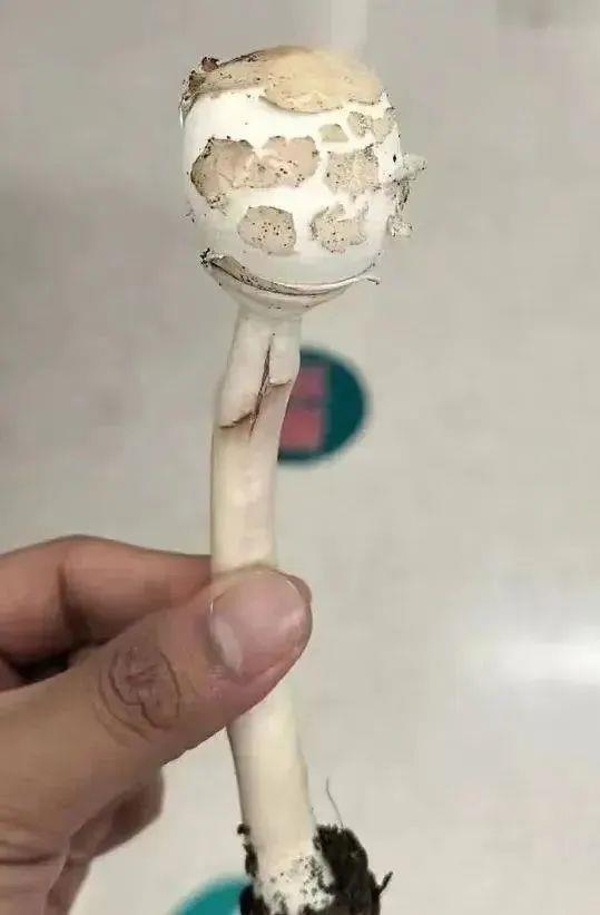 这些蘑菇伞盖为白色,分布着褐色斑点,菌杆较长,呈浅棕色,医生高度怀疑其为大青褶伞。